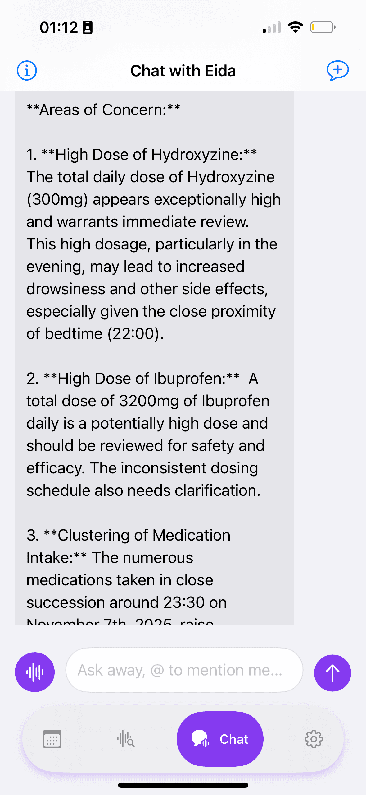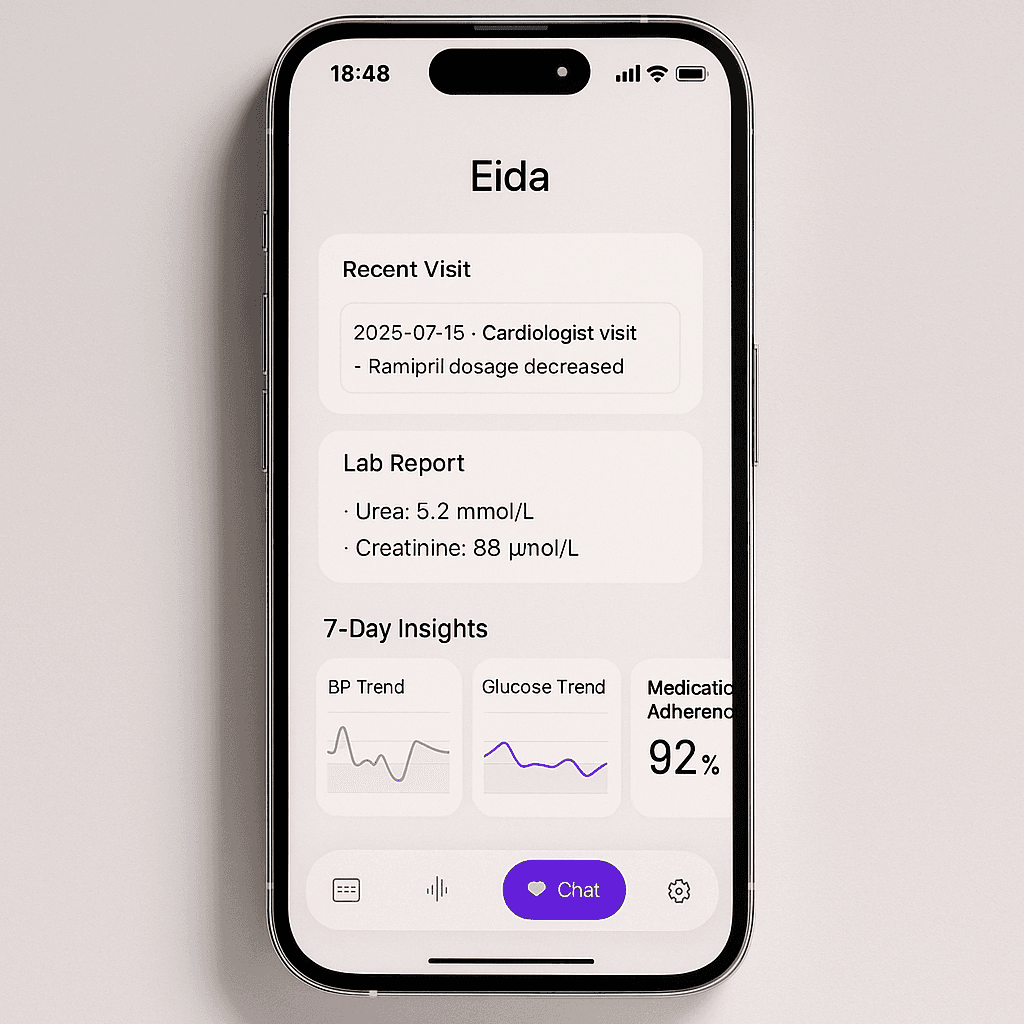 Eida listens to your daily patterns- logging routines, symptoms, diet, weather, and meds- offering multi-morbid patients and clinicians a continuous, insight-driven bridge between doctor visits