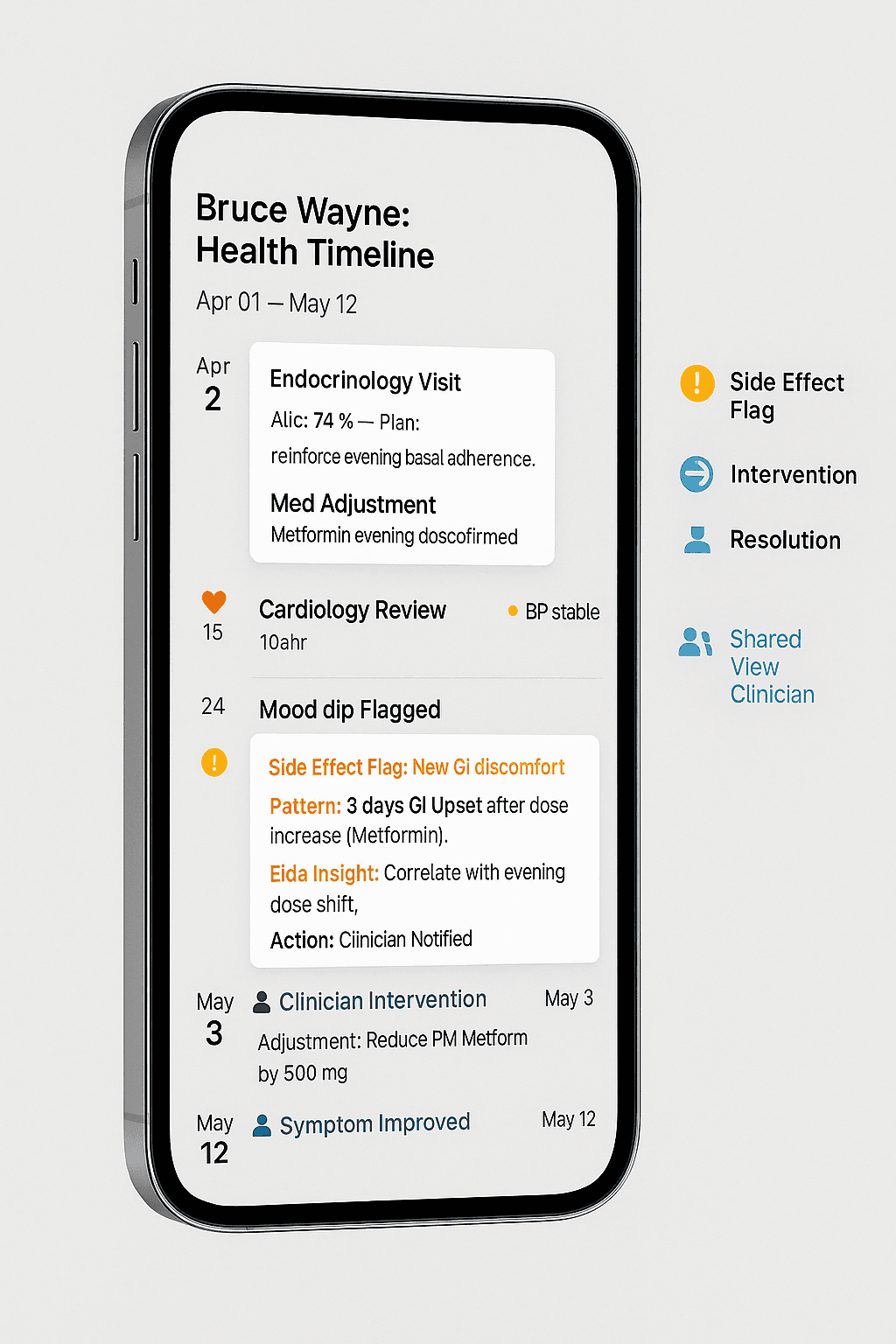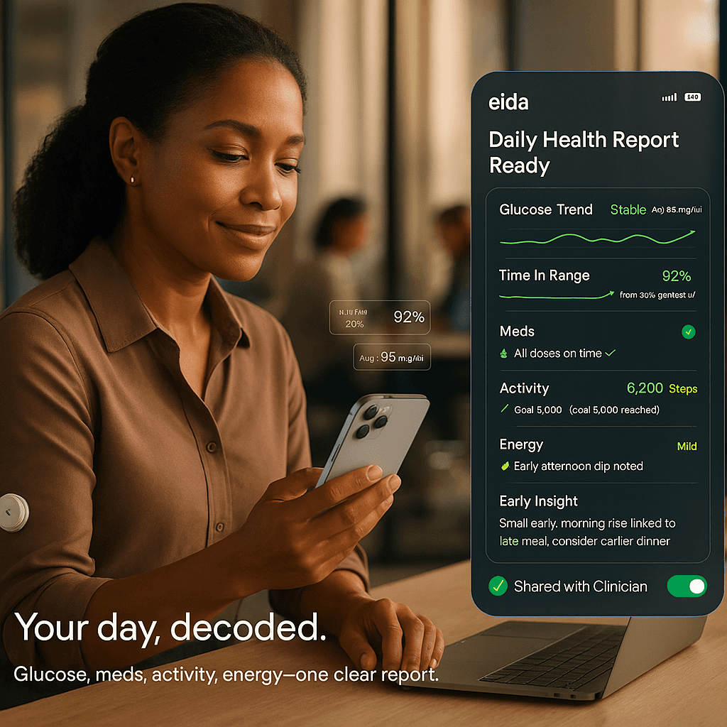 Eida lives in your routine: quietly tracking, adjusting, and looping in clinicians when it matters.