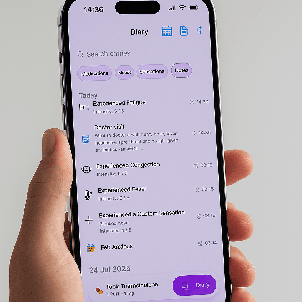 Eida quietly picks up daily signals (symptoms, meds, sleep, context like diet) and learns your baseline- no constant logging